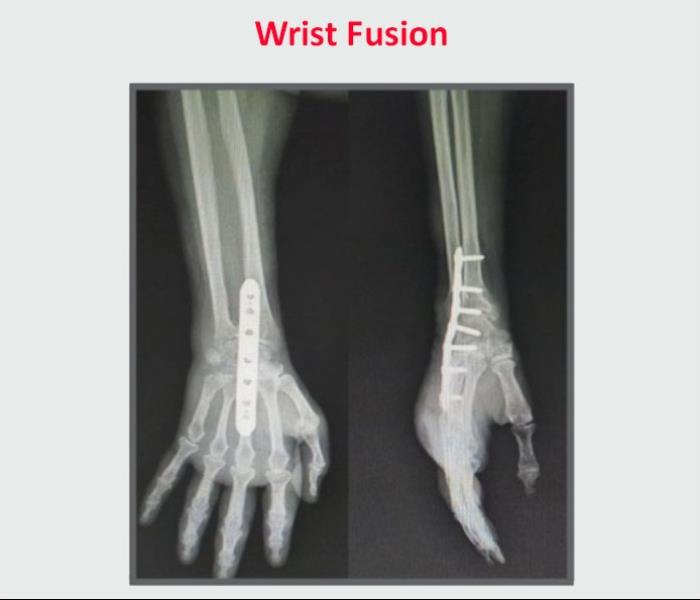 The arthritic surface is removed and the bones on each side of the joint are fused together. Joint fusion may be used to relieve pain and correct deformities that interfere with functioning. With a wrist fusion, you will lose some motion but you will regain a strong wrist. This is especially important if you work with your hands or need strength more than flexibility. A wrist fusion is usually the best surgical option for patients who are active.